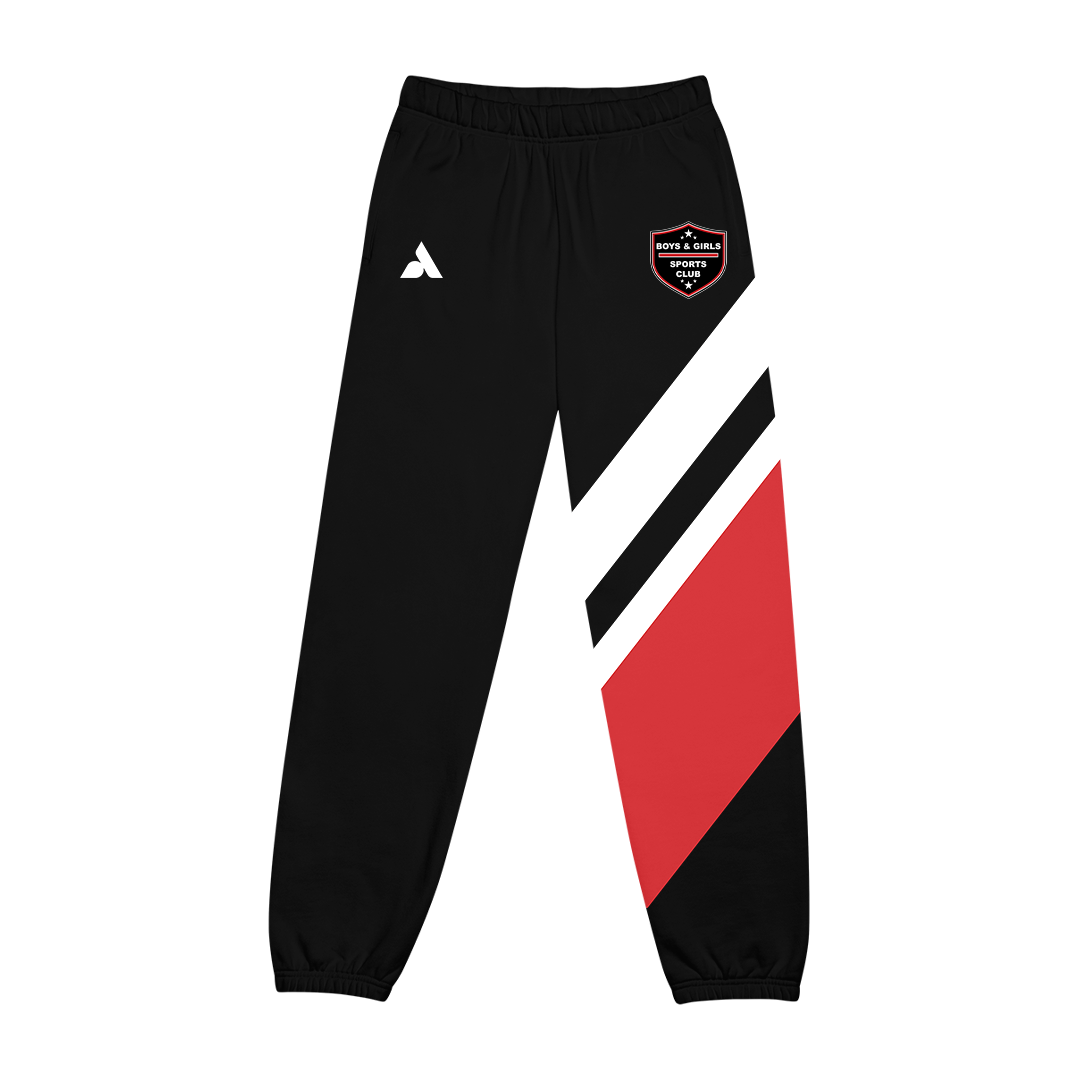 Choose a bold polyester-fleece edition with a striking black, red, and white graphic down the left pant leg for game-day energy, or a clean, classic black cotton-fleece look for everyday comfort; both feature the Boys & Girls Sports Club crest on the left pocket, an elastic drawcord waist, and a relaxed, athletic fit built for running, sliding, and cheering from the sideline.